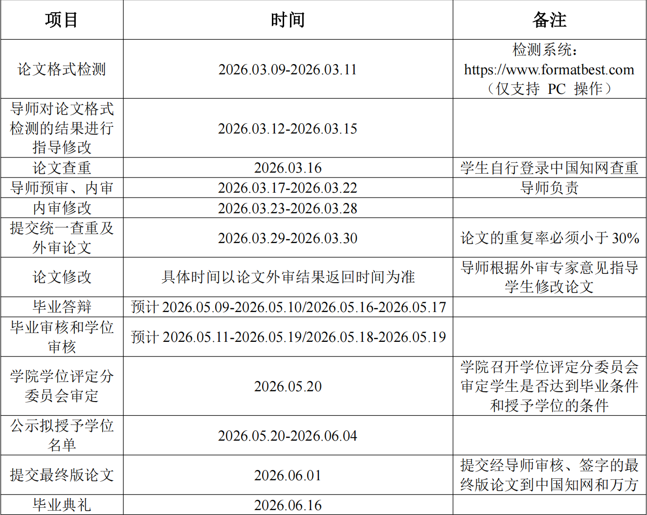生物与医药专业硕士点 2026 年夏季毕业研究生 学位论文评审、答辩及学位授予等工作安排时间表